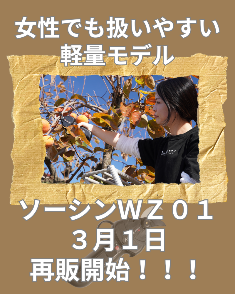 電動剪定ハサミ専門メーカー・ソーシンテクノロジージャパンです。明日、 3月1日からソーシンWZ01が再販売開始します。Amazonにて販売です。