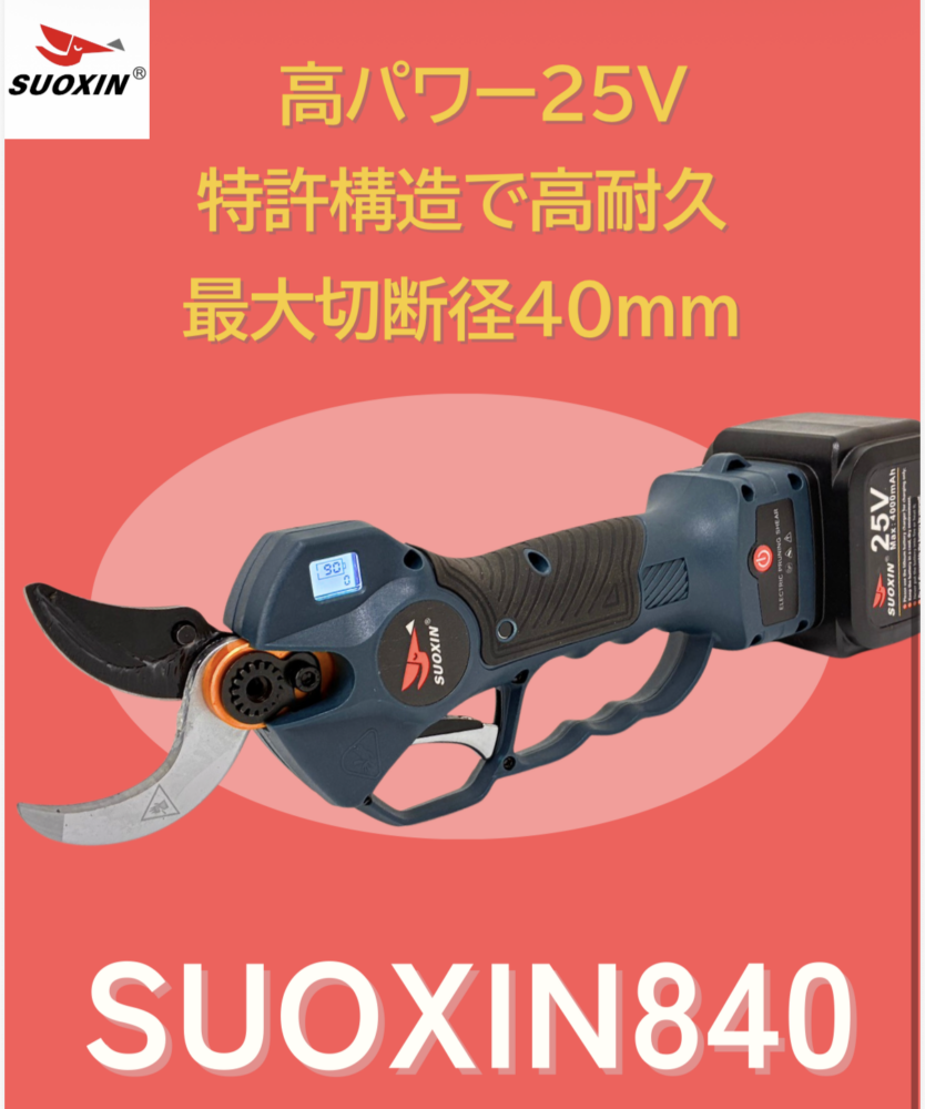 太い枝の切り落とし作業に、ソーシン840をお勧めします。バッテリー25V 40㎜の切断能力を持っている優れた電動剪定ハサミです。